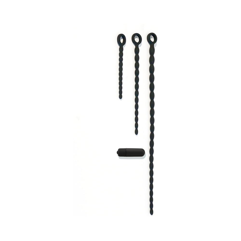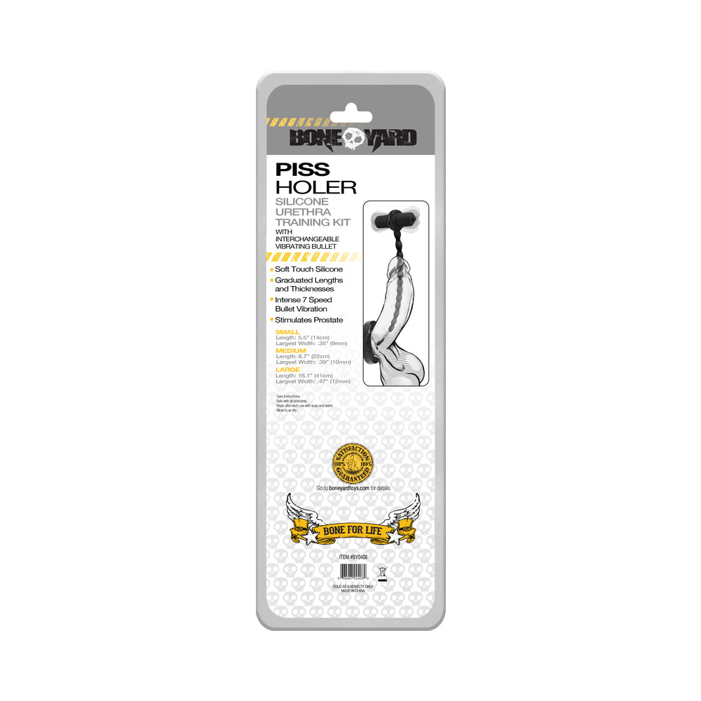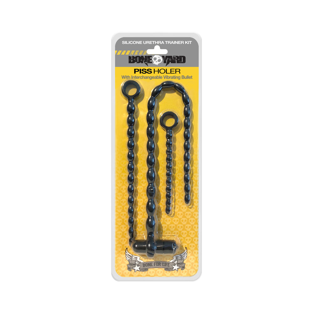 The Piss Holer is a sounding kit for the beginner to the advanced enthusiast. The kit includes three silicone sounding rods in graduated lengths and thicknesses. The beaded flexible sounds bend with the body, to make it easier to go deeper and hit your prostate. The beaded design allows lubricant to stay between the beads as you insert them, to make it easier to slide in without re-lubricating so often. The kit also includes an interchangeable 7-speed vibrating bullet, with 7 different strengths and patterns that travel down the entire length of each sound. When inserted through the circular opening on the top of each sound, the bullet also acts as a handle to easily guide each sound while inserting for that unique prostate sensation that you crave. Made of premium, medical grade silicone. These urethral sounds are easy to sterilize and body safe for an all new sounding experience. Soft Touch Silicone 3 Graduated Sizes Intense Stimulation Super Flexible Stimulates Prostate Small Length: 5.5 inch (14 cm) Largest Width: 0.35 inch (9 mm) Medium Length: 8.7 inch (22 cm) Largest Width: 0.39 inch (10 cm) Large Length: 16.1 inch (41 cm) Largest Diameter: 0.47 inch (12 mm) This product is safe with all lubricants, completely hypoallergenic, non-irritating and compatible with sensitive skin.The Piss Holer is a sounding kit for the beginner to the advanced enthusiast. The kit includes three silicone sounding rods in graduated lengths and thicknesses. The beaded flexible sounds bend with the body, to make it easier to go deeper and hit your prostate. The beaded design allows lubricant to stay between the beads as you insert them, to make it easier to slide in without re-lubricating so often. The kit also includes an interchangeable 7-speed vibrating bullet, with 7 different strengths and patterns that travel down the entire length of each sound. When inserted through the circular opening on the top of each sound, the bullet also acts as a handle to easily guide each sound while inserting for that unique prostate sensation that you crave. Made of premium, medical grade silicone. These urethral sounds are easy to sterilize and body safe for an all new sounding experience. Soft Touch Silicone 3 Graduated Sizes Intense Stimulation Super Flexible Stimulates Prostate Small Length: 5.5 inch (14 cm) Largest Width: 0.35 inch (9 mm) Medium Length: 8.7 inch (22 cm) Largest Width: 0.39 inch (10 cm) Large Length: 16.1 inch (41 cm) Largest Diameter: 0.47 inch (12 mm) This product is safe with all lubricants, completely hypoallergenic, non-irritating and compatible with sensitive skin