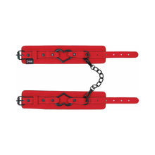 Embrace the seductive allure and indulge in every electrifyingly moment with the Amor Handcuffs. Feel the smooth vegan leather adorn your wrists in a stunning red finish with a dazzling black heart accent and give in to every restrained temptation. Light the erotic spark with your partner and surrender to blissful submission. Sumptuous red vegan leather cuffs with black accents Slightly curved metal heart comfortably resting on the cuffs 12in. cuffs with buckle clasp adjustments Materials: 60% PU, 20% Iron alloy, 20% Zinc alloyPackaging type: Hang CardPackaging: 8.25in. H x 5in. W x 1.5in. D