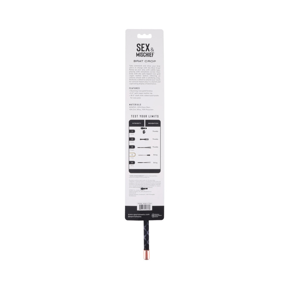 Take command and show your brat whoft.s in charge with the Brat Crop! Ramp up your play with subtle taps, playing with sensations across their body with the split tipped rose gold vegan leather before inflicting an intense smack with a satisfying snap. Perfectly crafted to extend your reach for sensual impact play in a stylish and captivating display of dominance. Stunning rose gold finishes 6.5in. split vegan leather tip 18.5in. shaft with rubberized handle for easy grip Materials: 60% PVC, 20% Glass fiber, 10% Zinc alloy, 10% PolyesterPackaging type: Hang CardPackaging: 17.25in. H x 3.5in. W x 0.57in. D