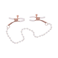 Take a tastefully tantalizing step into deeper sensations with thePeaches ''n CreaMe Pearl Nipple Clamps. Explore delicious sensitivity right where you want it most with dual adjustable clamps in stunning rose gold with pearl accents. White rubberized tips add a playful pop of color to your play and keep the clamps from slipping as you tease and pull your lovers chain, bringing intense feelings to their body. Faux pearl adorned chain Nickel-free rose gold chain White rubber tipped adjustable nipple clamps increase sensitivity Includes one set of nipple clamps Materials: 50% ABS plastic, 40% Iron, 10% PVC
