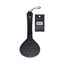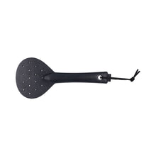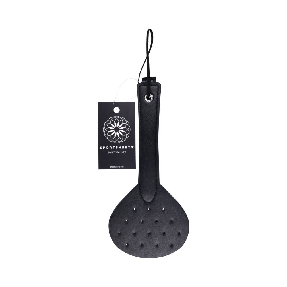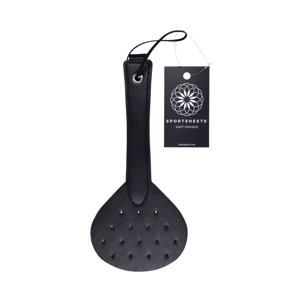 Seize control and ignite fresh excitement with the beguiling sensations and endearing smacks of the Swift Spanker. Perforated with holes scattered across the split tipped edge for reduced resistance and a satisfying smack strong enough to leave dotted patterns across the body. Use it to enact the perfect punishments or for pleasurable pats with swift accuracy to keep your partner on edge with anticipation.Features 11.5in. long paddle with looped handle Perforated for less air resistance with each swing Split tip faux leather spanker Materials: 90% PU, 5% Iron, 5% Microfiber